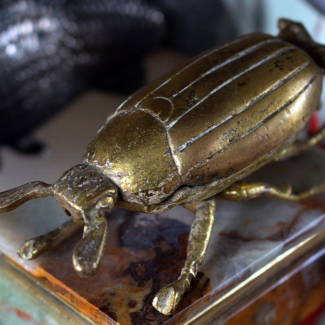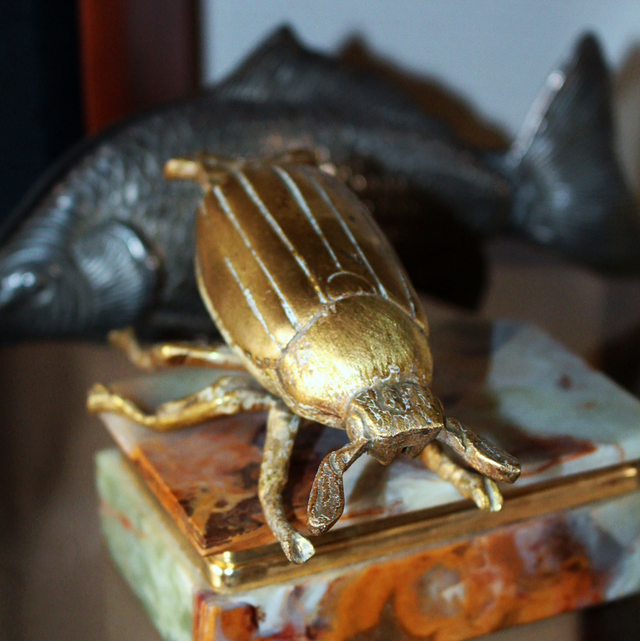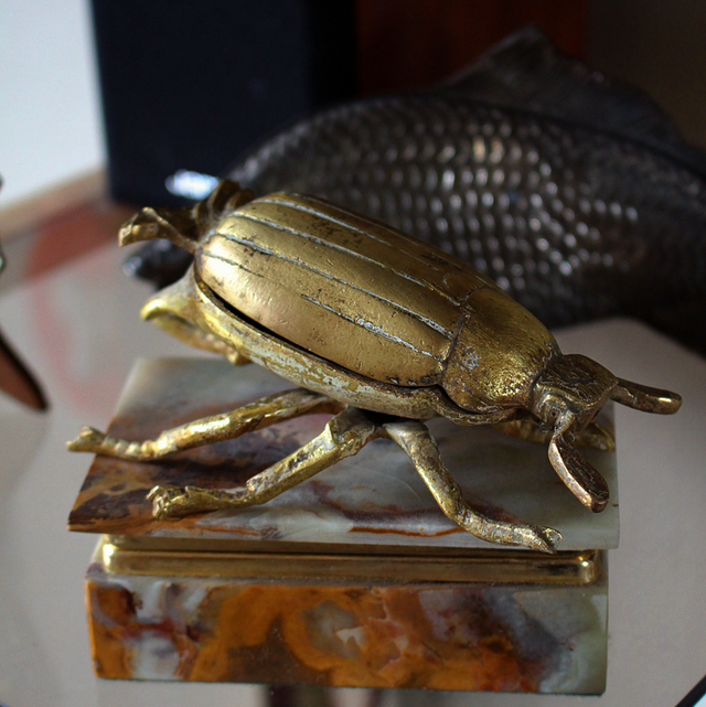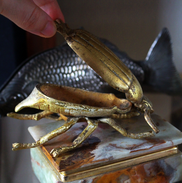 Après l’araignée et la mouche, voici le scarabée cendrier, une première sur ma page! Ce cendrier en laiton date des années 50-70. Son couvercle articulé révèle un petit compartiment, idéal comme cendrier, vide-poches ou simple objet de curiosité. Avec ses détails gravés et sa patine dorée, il apporte une touche déco unique, entre art déco et charme vintage.