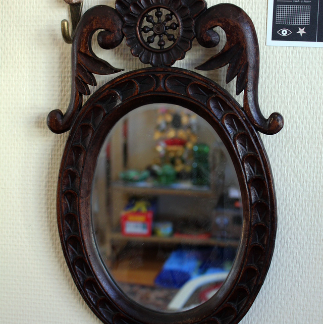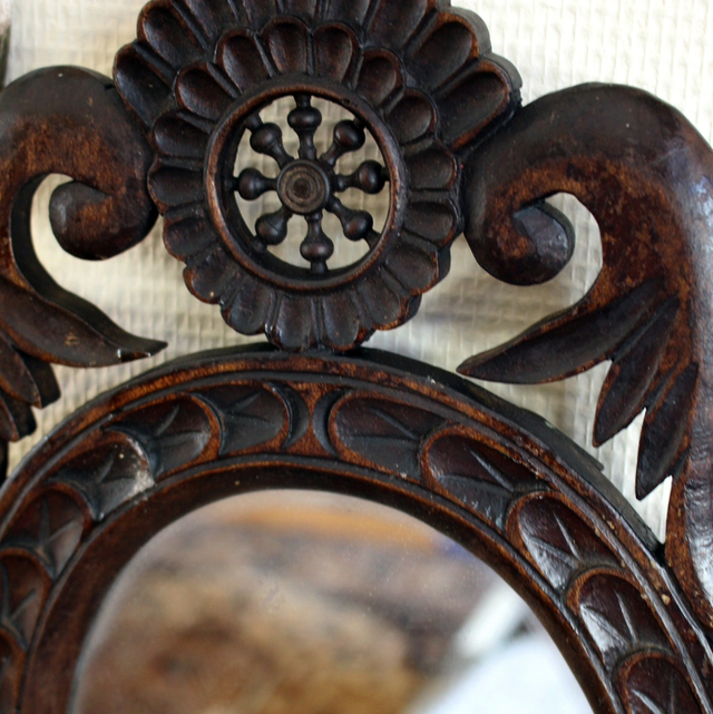 Miroir ovale ancien (année 70 peut être) en bois noirci, biseauté sur son contour, surmonté de quelque chose ressemblant à un gouvernail.